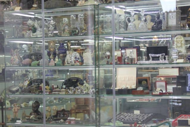 The used items in the boutique shops in the upper levels are mostly organized. Antique furniture and artwork, vintage clothing, old books and records, and other collectible items are neatly displayed.